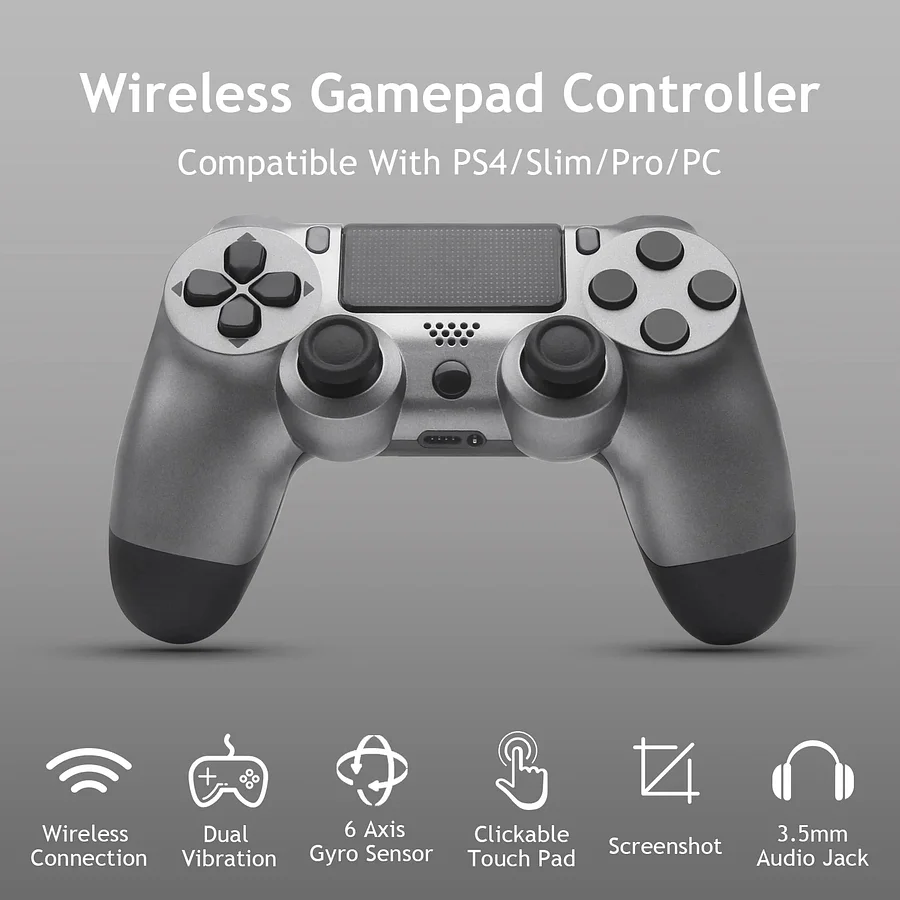 Wireless controller for PS4 with 6-Axis Gyroscope&Dual Vibration &Clickable Touch Pad : The highly sensitive 6-Axis gyroscope supports direction control, shooting aim and character input; the dual vibration gives you the authentic attack and shooting experiences and the clickable touch pad supports click and touch functions to meet your needs.